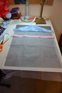 Place the slip (cut out side up) along the edge of the front of the washing bag (zipper out) with the raw edge to the top of the bag: