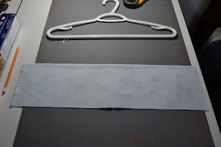 Place the hanger on a piece of fabric with the neck of the hanger on the fold of the fabric. As you can see, the width of my bag is very similar to the width of the hanger.