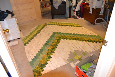 Here it is laid out on my bedroom floor, or mostly laid out. All the green strips are sewn together. It's just a matter of sewing the white sections together and then joining them to the green sections. (Click on photos to enlarge).