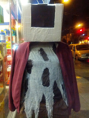 Here's Andrew in his Zombie costume, wearing a friend's home-made robot mask: